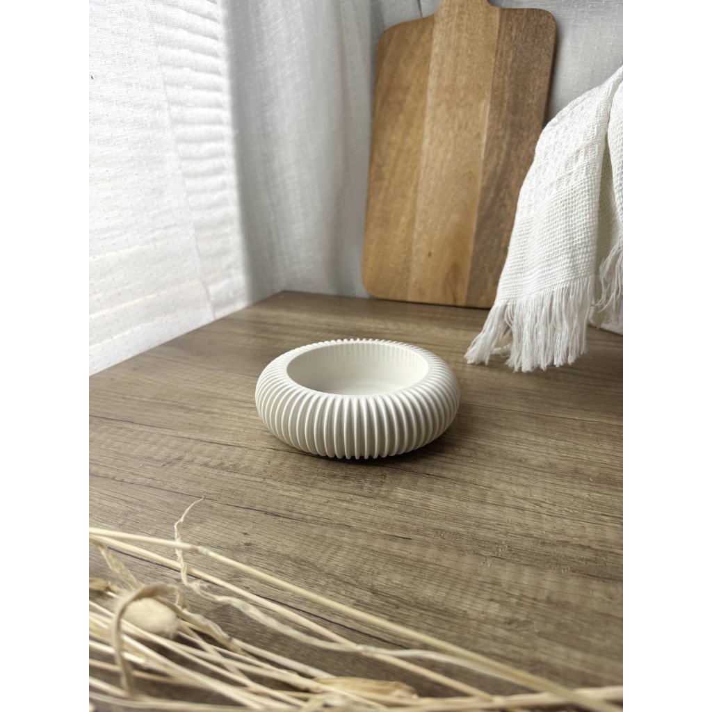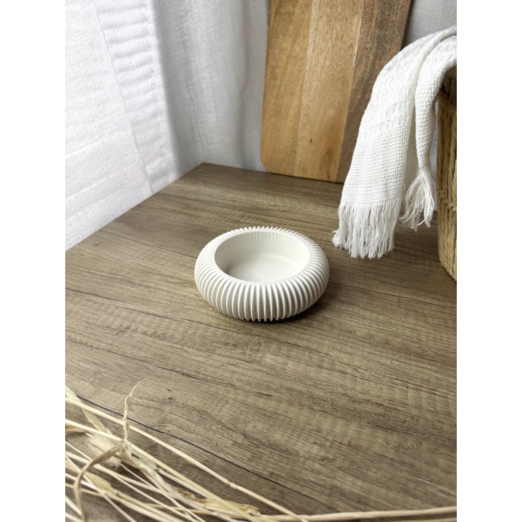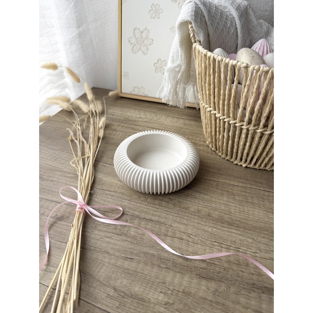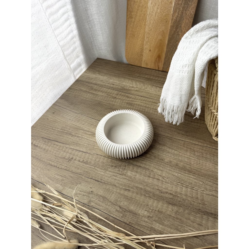Čistý kulatý tvar doplněný o vroubky, které ji dělají výjimečnou. Miska pro všechny tvoje malé poklady, co si zaslouží své místo.